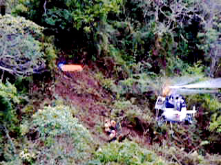 17:00 HLV: El sargento Márquez desciende exitosamente al sitio donde se encuentra el extraviado, se recogen las cuerdas y nos mantenemos orbitando la zona a esperar que nos indique que todo está listo para la extracción.